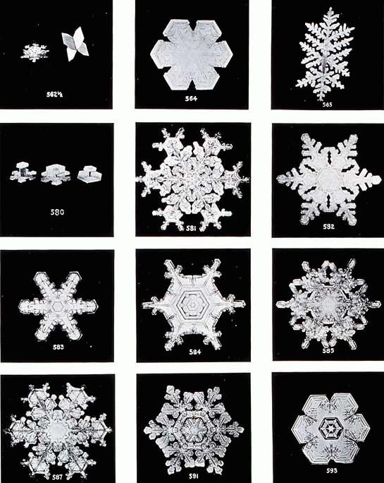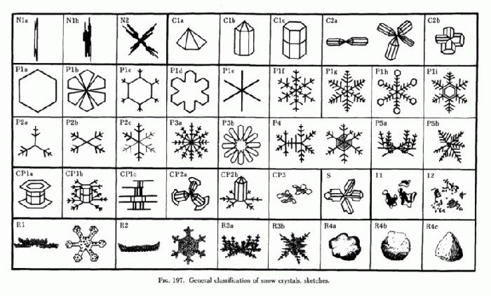 Ukicsiro Nakaya által kategorizált hópelyhek (forrás: www.its.caltech.edu)