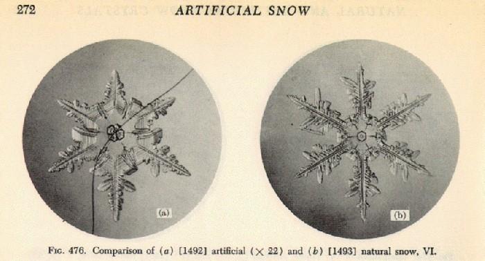Követõje Ukicsiro Nakaya japán (eredetileg atom-) fizikus már képzett tudósként hûtött laboratóriumában tanulmányozta, fényképezte és kategorizálta a kristályokat, nem csupán a szépeket, hanem a torz vagy nem szokványos alakúakat is. Nakaya hópihéi - bal oldalon az általa létrehozott mesterséges, jobbra a természetes pihe: