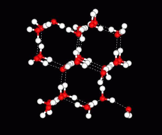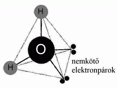 A tetraéder szögei már 109,5 fokosak lesznek. Vízmolekula fagyáskor tetraéderes szerkezetet vesz fel A hidrogén és e nemkötõ párok segítségével kapcsolódnak egymáshoz a vízmolekulák, a molekulák persze a számukra legkedvezõbb energiájú helyzetet veszik fel, s a hidrogénkötések kapcsolják egybe õket, fagyáskor stabilizálódva. A tetraéderek szabályos elrendezõdése hozza létre a hatszöges szimmetriát mutató vízjeget. A növekvõ jégkristály sarkain mindig van nemkötõ elektronpár, így a következõ vízmolekula ide szeretne majd kapcsolódni - ezzel a molekulaszintû hatszöges szimmetriát lassacskán látható méretûvé teszi.