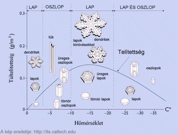 A jégben az egybekapcsolódó vízmolekulák tetraéderei hatszöges térbeli elrendezõdést eredményeznek A kezdetekkor egy már kis nagyítással is látható, de igencsak aprócska hatszöghasáb keletkezik, amelynek egyelõre nincsenek kinyúló ágai. Az, hogy milyen alakú lesz a hatszöghasábból kifejlõdõ hópihe, a környezeti körülményektõl függ. Számos kutatás folyt már e témában, nem csupán a természetben kialakult hópelyhek megfigyelésével, hanem mesterségesen, laboratóriumokban növesztett kristályokkal is. Ezekbõl az tudjuk, hogy a legfontosabb a hópelyhek alakja szempontjából a hõmérséklet, a telítettség mértéke, a légnyomás, a szél. A hópelyhek kialakulási feltételek - hõmérséklet, telítettség - szerinti diagramja Ezen körülmények számtalan kombinációban állhatnak elõ, mind egy-egy hópihe mikrokörnyezetében, mind a kialakuló hófelhõ egészét tekintve. A hópihe persze nem marad egy helyben a felhõben, hanem folyamatosan vándorol, így növekedése során eltérõ körülmények közé kerülhet, megváltoztatva ezzel a kialakuló formát. Annál szabályosabb lesz a forma, minél inkább egyezõek a körülmények a felhõben. Ha a lefelé tartó hópihe kevéssé hideg légrétegen jut át, több pihe egybekapcsolódhat, összefagyva már igen tekintélyes méretû pihecsomók hullhatnak, ezért is van enyhébb téli idõben látványos, nagypelyhes havazás.