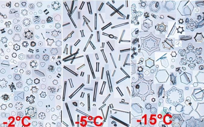 Eltérõ hõmérsékletben létrehozott mesterséges hópelyhek, a képrészeken feltüntetve a kialakuláskori hõmérsékletet (forrás: www.its.caltech.edu )