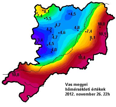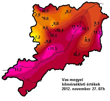 Hõmérsékleti eloszlás Vas megyében 2012. november 26-án este 10 órakor, valamint 27-én reggel 7 órakor: