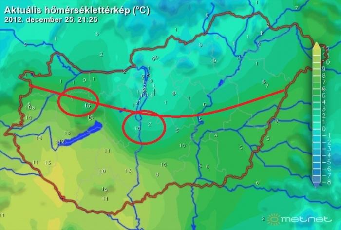 Ami talán ezeken felül is még érdekesebb az az, hogy hazánk a meleg és hideg határán található. Így a délnyugati területeken a meleg levegõ, addig az északkeleti megyékben a hideg levegõ érezteti hatását.