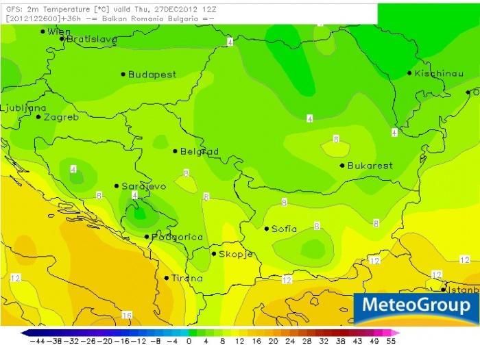 A holnapi napon már a nagy hõmérsékleti kontrasztok meg fognak szûnni az országban. Hazánk nagyobbik részén 5 °C alatt fognak maradni a hõmérsékleti értékek, egyedül a délnyugati területeken lehet 6-7 °C-os maximumokra számítani. Az ország középsõ területein 4 °C, míg az északkeleti megyékben 0 °C körüli hõmérsékletekre kell számítani.