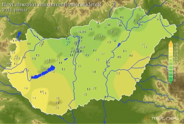 Az abszolút maximum-hõmérsékleti térképrõl leolvasható, hogy az országban, legalább egyszer 10°C felett volt. Ez a hónap során többször is megtörtént, a déli és a nyugati területeken. A legmagasabb értékeket a nyugati megyékben mérték.