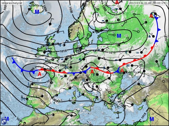 Európát jelenleg egy nyugat-keleti irányú, hosszan elnyúló, hullámzó frontálzóna szeli ketté, melytõl északra igen hideg az idõ, míg délebbre enyhe levegõ az uralkodó. Magyarország eme frontálzóna déli oldalán helyezkedik el, így csütörtökig marad az enyhe idõ: