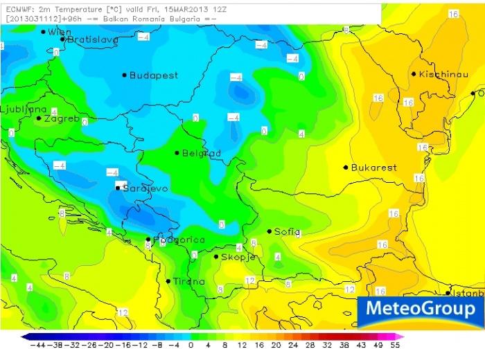 Nemzeti ünnepünk napjára már az egész ország a viszonylag gyors mozgású mediterrán ciklon hátoldalára kerül, így eláraszt minket az igen hideg, fagyos levegõ, melynek hatására napközben is csupán fagypont körüli értékeket mérhetünk majd: