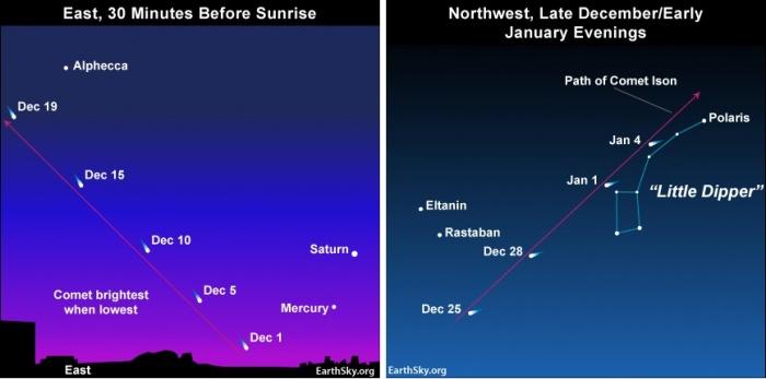 2. Mivel az üstökösmag viszonylag nagy méretû, és napközelben hatalmas sebességgel (400 km/s) halad, valószínûbb, hogy az extrém forróságban sem párolog el teljesen. Mit láthatunk az égen ebben a szerencsés esetben? Az üstökös legnagyobb fényességét (ami a Vénuszéval, esetleg a Holdéval is vetekedhet) a napközelség idején éri el. Ám ekkor a napkorong szomszédságában, a világos égbolton láthatnánk, bajos lenne tehát észrevenni. Decemberben, a Naptól távolodóban viszont heteken át fényes, hosszú csóvával díszítheti egünket. December elsõ felében a hajnali órákban, közvetlenül világosodás elõtt lesz érdemes megfigyelni a keleti égbolton. Megrögzött késõn kelõk december 10. körül már az esti sötétedés után, a nyugati égbolton is elcsíphetik, ám este a horizonthoz közelebb látszik majd, viszonylag hamar lenyugszik, és a Hold fénye is gyengítheti a látványt. A hónap vége felé viszont már egész éjszaka látható lesz a halványodóban lévõ, de remélhetõleg nagyméretû csóvát mutató üstökös, ami december 26-án kerül „legközelebb” (kb. 70 millió kilométerre) a Földhöz. Az üstökös látszó égi helyzetét az alábbi ábrák mutatják. (Balra: hajnalban, jobbra: este. Forrás: www.earthsky.org.)