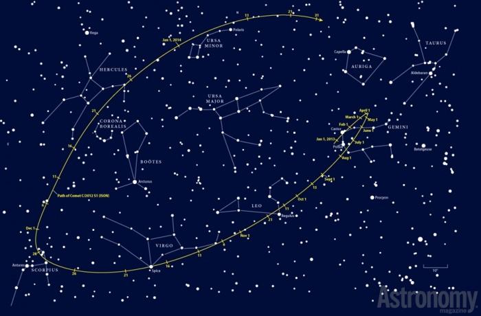 A szóban forgó üstököst 2012 szeptemberében fedezték fel az ISON (International Scientific Optical Network) program automata távcsövének képén. Már az elsõ pályaszámítások után nyilvánvalóvá vált: ez nem csupán egy az évente megjelenõ több tucatnyi, jórészt csak nagy távcsõvel látható üstökös közül. Utólag olyan fényképeken is rátaláltak, amik 2011-ben készültek, pedig akkor az ISON még igen messze, a Jupiter pályáján kívül járt. Az ottani hidegben az üstökösmagok illékony anyagai (vízjég, szén-dioxid, ammónia, metán) még alig-alig párolognak; az ennyire korán észrevehetõ példányok tehát a szokottnál nagyobb méretûek, magjuk átmérõje több kilométer is lehet. Még fontosabb, hogy az ISON rendkívül közel fog kerülni a Naphoz: 2013. november 28-án mindössze 1,16 millió km-re halad el annak felszínétõl. (Összehasonlításként: a Nap átmérõje 1,39 millió km, a Föld pedig mintegy 150 millió km-re kering tõle.) Ebben a távolságban az üstökösmag nagyjából 2000°C-ra forrósodik, így anyagából a jég mellett már a kõzetdarabok is hevesen párologni kezdenek. A "napsúroló" üstökösök emiatt rendkívül fényessé válnak, és elpárolgó anyagukból látványos csóva alakul ki. Ritka esemény ez: az elmúlt évtizedekben az Ikeya-Seki (1965-ben) és a Lovejoy-üstökös (2011-ben) ért el ilyen napközelséget. (Tekintsünk most el a csupán pár méteres „mini-napsúrolóktól”, melyek utolsó pillanatait a napkutató ûreszközök gyakran megfigyelik, de a földi észlelõk számára láthatatlanok.) A 2011-es Lovejoy-üstökös helyzete miatt csak a déli féltekérõl volt látható, de az ott készült fotók, pl. Grant Bisset képe Új-Zélandról (www.spaceweather.com) magukért beszélnek...