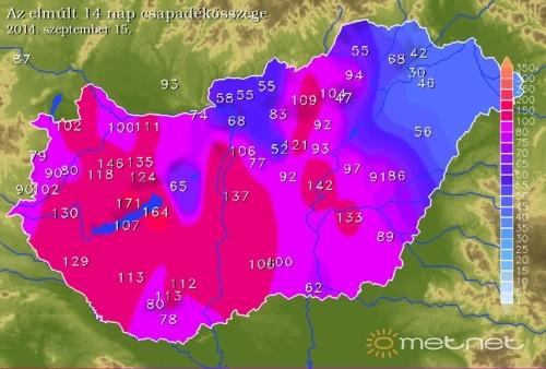 1. ábra: 2014. szeptember 15-ét megelõzõ 14 nap csapadékösszege (metnet.hu)