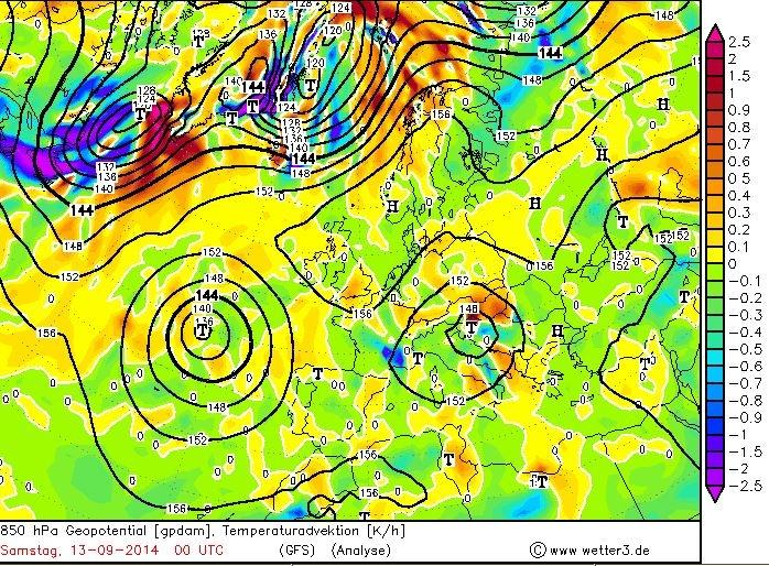 9. ábra: 850 hPa-os hõmérsékleti advekció Európában 2014. szeptember 13-án 0 UTC-kor a GFS modell analízise alapján