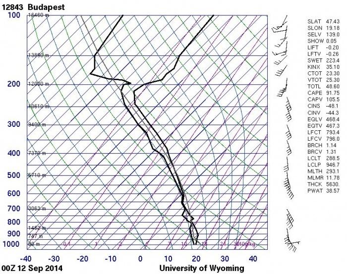 11. ábra: a 2014. szeptember 12 0 UTC-kor felbocsátott budapesti rádiószondás felszállás ferdediagramon ábrázolva (http://weather.uwyo.edu/upperair/sounding.html)