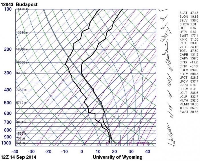 12. ábra: a 2014. szeptember 14 12 UTC-kor felbocsátott budapesti rádiószondás felszállás ferdediagramon ábrázolva (http://weather.uwyo.edu/upperair/sounding.html)
