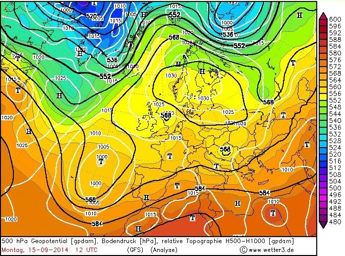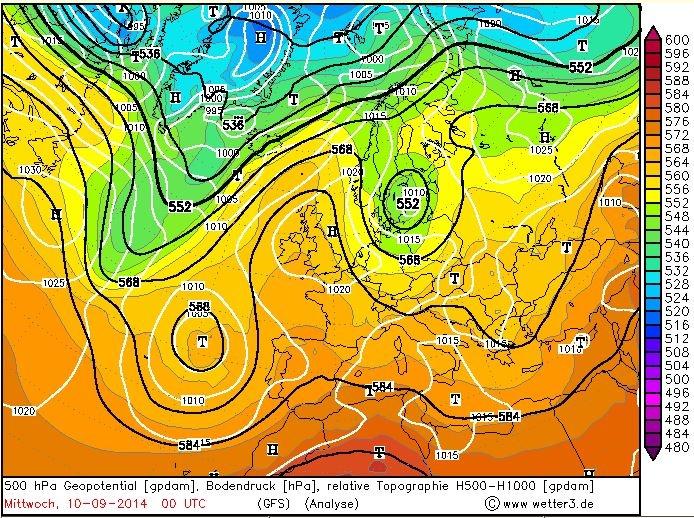 2. ábra: izobár és relatív topográfia mezõ Európában 2014. szeptember 10-én 0 UTC-kor a GFS modell analízise alapján