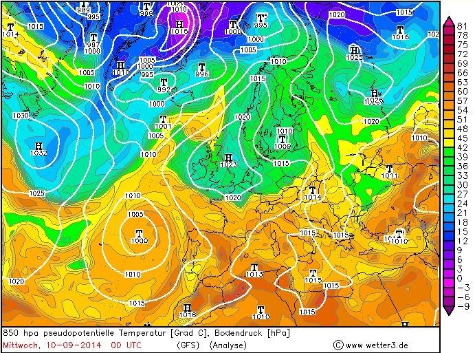 3. ábra: 850 hPa-os pszeudo-ekvivalens potenciális hõmérsékleti mezõ Európában 2014. szeptember 10-én 0 UTC-kor a GFS modell analízise alapján