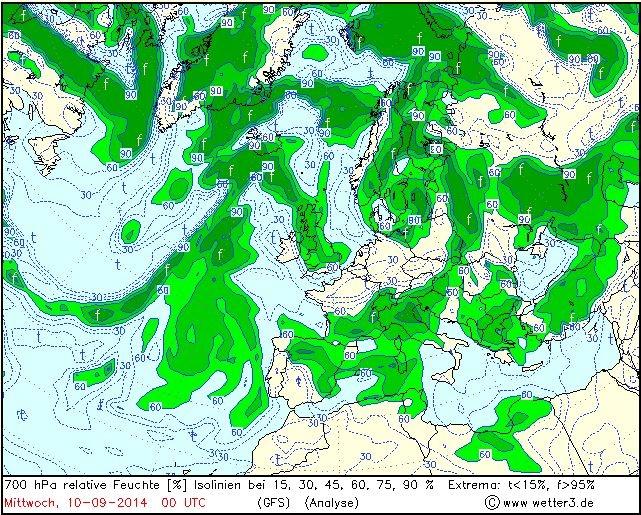 4. ábra: 700 hPa-os relatív nedvességi mezõ Európában 2014. szeptember 10-én 0 UTC-kor a GFS modell analízise alapján