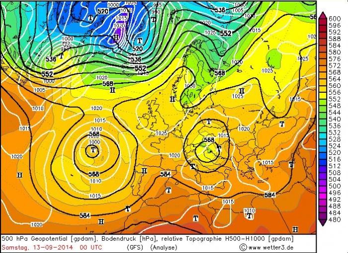 6. ábra: izobár és relatív topográfia mezõ Európában 2014. szeptember 13-án 0 UTC-kor a GFS modell analízise alapján