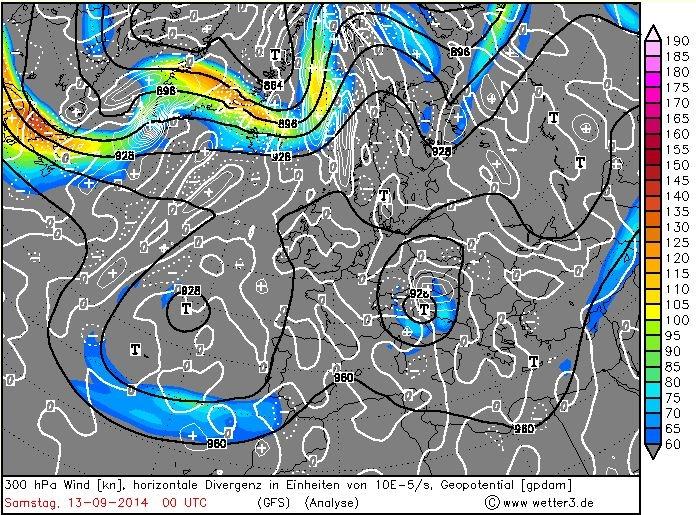 7. ábra: 300 hPa-os szél- és divergencia mezõ Európában 2014. szeptember 13-án 0 UTC-kor a GFS modell analízise alapján