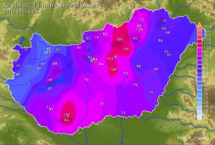 Az elmúlt 14 nap csapadékösszege. Láthatjuk, hogy legjobban az Északi-középhegység és a Mecsek térsége profitált a csapadékból. A legnagyobb 14 napos csapadékösszeg Komlón volt: 152 mm, de Hevesen 137,2 mm-t, Kékestetõn 129,5 mm-t, Szentmártonkátán 122,7 mm-t regisztráltak észlelõink