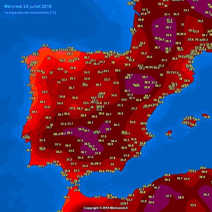 Az Ibériai-félszigeten ismét Spanyolország északkeleti és déli részein mérték a legmelegebbet. Több meteorológiai állomás mért 40 fok feletti maximumokat. A legmelegebb Zaragoza városában volt, ott 40,9 fok volt a maximum.