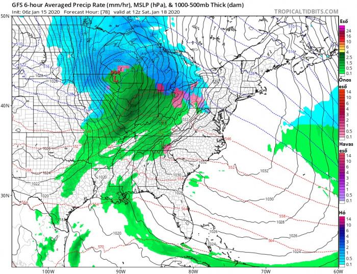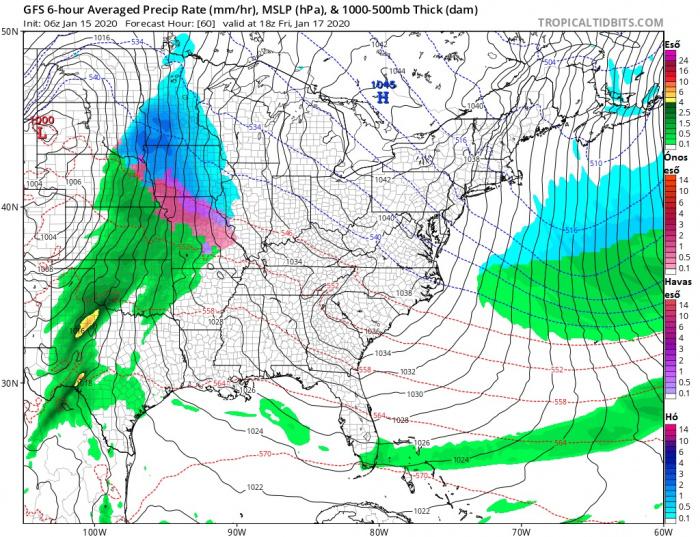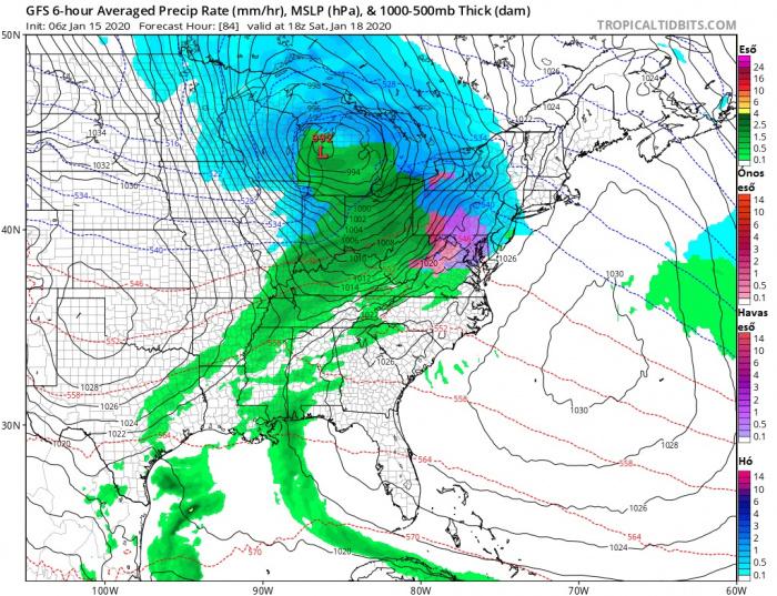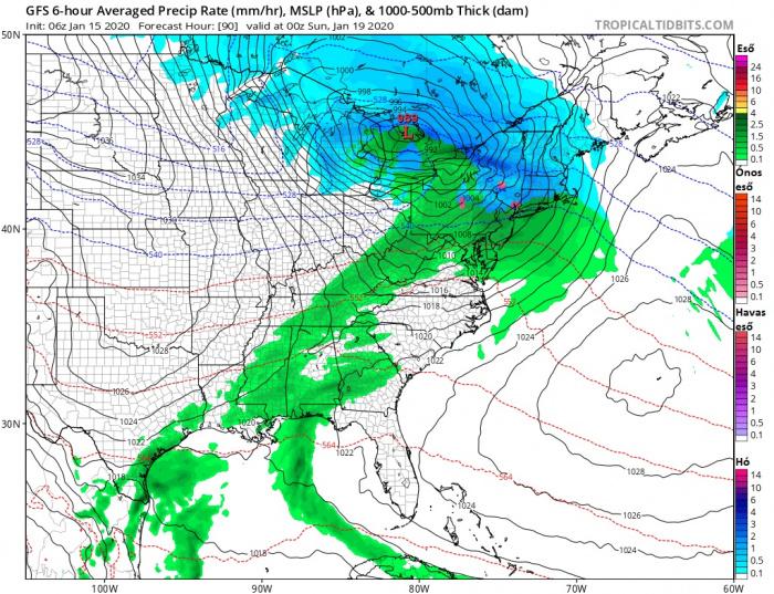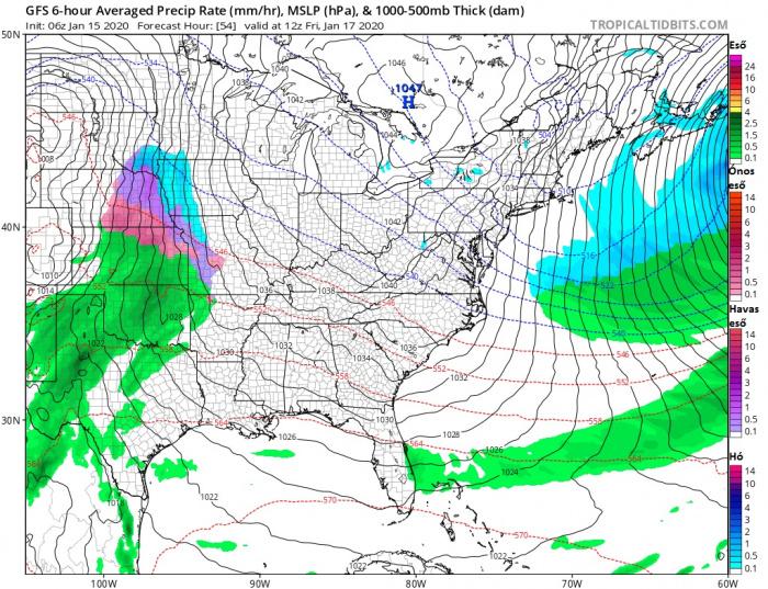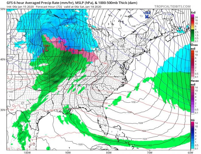 A ciklon a jelenlegi számításokat tekintve a Sziklás-hegységtől keletre erőre kap, megerősödik és folytatja útját északkelet felé. Lentebb hét térképen láthatjuk a hat órás átlagos csapadék-intenzitást, valamint a csapadék alakját péntek 12 UTC-től vasárnap éjfélig.