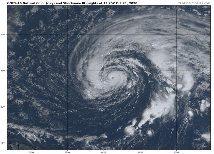 A nyílt óceán felett vonuló Epsilon hurrikán még csak látványossággal szolgált (NOAA / Tropical Tidbits)...