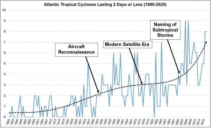 Mindez visszaigazolja, hogy a ciklonok számának növekedése nem feltétlenül valós trend, hanem az egyre fejlettebb megfigyelési lehetőségek, illetve az időközben változó besorolási rendszernek is köszönhető. Az alábbi grafikon például azt mutatja be, hogyan alakult a mindössze legfeljebb 2 napig fennálló trópusi ciklonok száma az elmúlt évek során. Szembetűnő, hogy ezek növekedése a repülőgépes, majd műholdas mérések elterjedésével, javulásával kezdett határozottan növekedni az 1940-es, 50-es évek körül, majd egy átmeneti stagnálás után a 2000-es években ugrásszerű növekedés történt, amikor a korábbi gyakorlaton változtatva elkezdték elnevezni a szubtrópusi ciklonokat is. E tekintetben egyébként a 2020-as szezon a 2. helyen végzett 8 ciklonnal, csak 2005-ben és 2007-ben volt ennél 1-gyel több rövid életű ciklon.