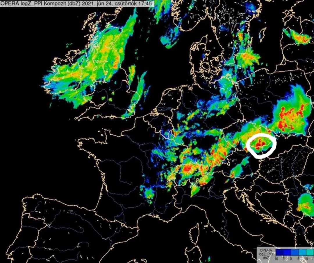 Kompozit radarkép június 24-én 17:45 perckor. A behatárolt területen a tornádót okozó szupercellás zivatart láthatjuk a radarképen. Forrás: OMSZ