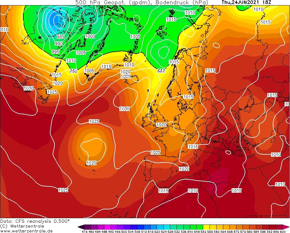 GFS 500 hPa nyomási elrendeződés június 24-én 18:00 UTC-kor. Jól látható a hosszan elnyúló alacsony nyomású terület délnyugati irányban, melynek hullámzó frontálzónája kettészelte Európát.