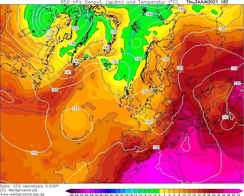 GFS 850 hPa (kb 1500 méter) hőmérsékleti elrendeződés június 24-én 18:00 UTC-kor. Nyugat-, illetve Közép-Európa között éles hőmérsékleti kontraszt alakult ki. Az atlanti hűvös légtömegek a fronttól nyugatra, míg a Szahara felől érkező meleg, nedves légtömegek keletre húzódtak, beleértve hazánkat is.