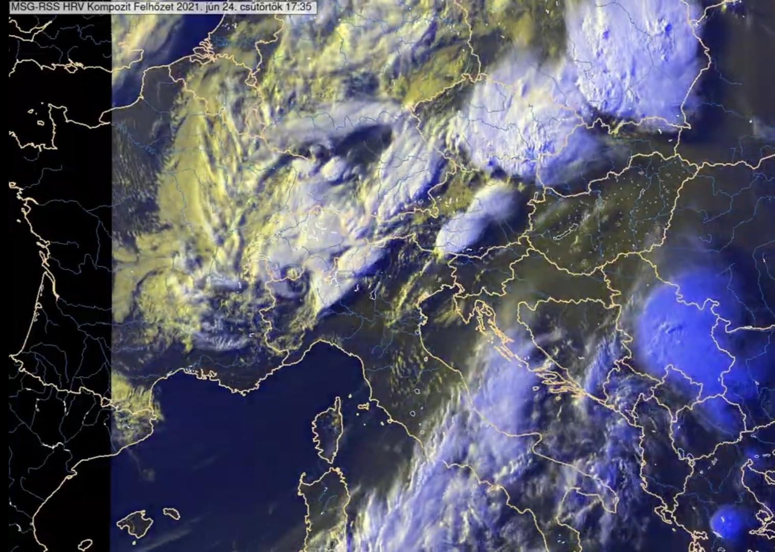 Látható tartományú, kompozit műholdkép. Tőlünk északnyugatra, északra heves viharok vonultak a frontvonal mentén, s ez jól ki is vehető a felvételen. Forrás: OMSZ