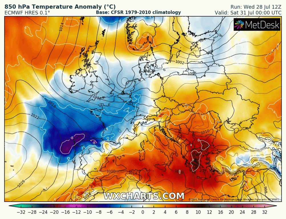 A jelenleg még az Északi-tenger felett örvénylő ciklon fokozatosan Skandinávia fölé helyeződik. A ciklon hidegfrontjának előterében forró levegő érkezik a Kárpát-medence, így hazánk fölé is. A hidegfront a mostani számítások szerint szombatra virradóra éri el hazánk északnyugati határát.