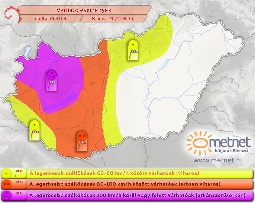 Szombatra virradó éjszaka a mediterrán ciklon hatására eleinte északnyugaton, majd szombaton a délután második felétől kezdve a Dunántúl többi részén is egyre nagyobb területen fokozódik viharossá az északi, északnyugati szél. Vasárnapra virradóra kiemelten a Dunántúl északnyugati részén, illetve a Balaton térségében és a Dunántúli-középhegységben 100 km/h-t meghaladó, erősen viharos széllökések is lehetnek, a magasabb hegycsúcsokon orkán erejű, 120 km/h-t meghaladó lökések is előfordulhatnak. A szél vasárnap napközben fokozatosan veszít majd az erejéből.