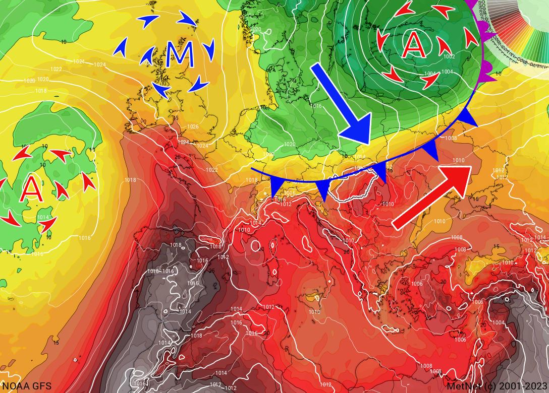 Szombaton a front előterében igen magasra emelkedik a hőmérséklet, többfelé mérhetünk majd 35 fok feletti értékeket, az Alföldön helyenként a 40 fokot is megközelítheti majd a hőmérő higanyszála. Az északnyugati csücsökbe viszont már beszivárog némi hideg levegő, aminek hatására ott már "csak" 30 és 35 fok közötti maximumok várhatóak.