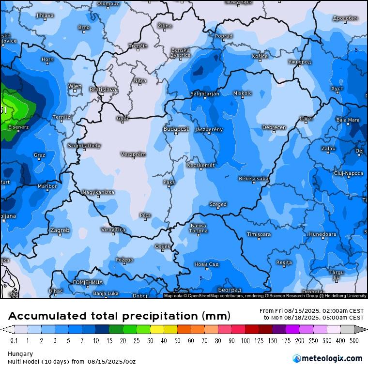 A cikk végén pedig érdemes kiemelni (a csalódások elkerülése végett), hogy nem mindenhol fog jelentős csapadék hullani ebből a frontból sem, lokálisan viszont előfordulhatnak jelentős csapadékösszegek is, viszont ez területi átlagban nagyjából csak az ország középső részén jelenthet jelentősebb csapadékot, ami a lenti térképen is jól látható.