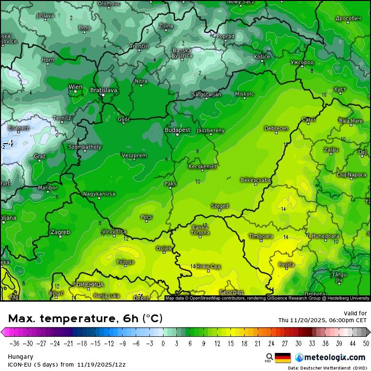Becsült hőmérséklet csütörtök délután (ICON modell)