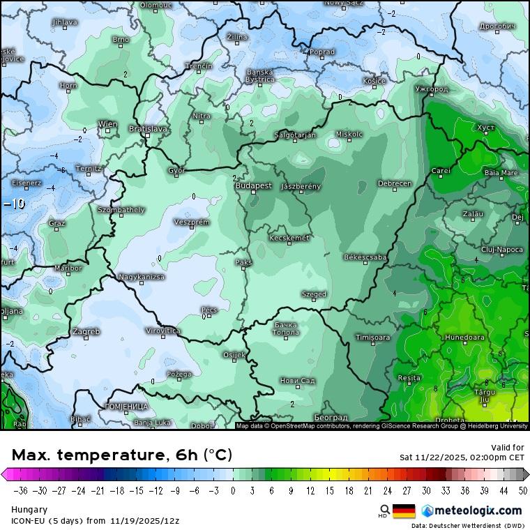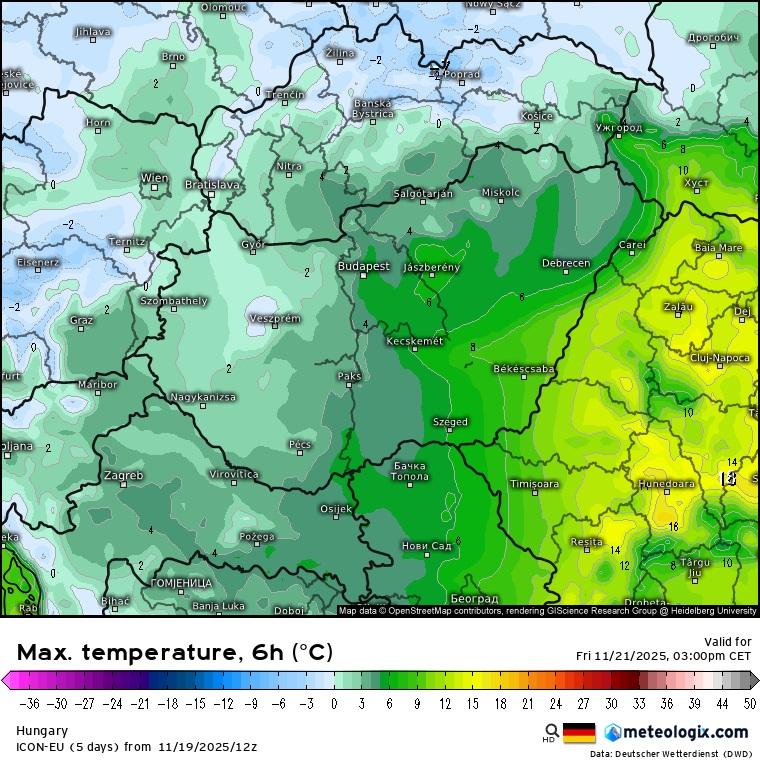 Becsült hőmérséklet péntek délután (ICON modell)