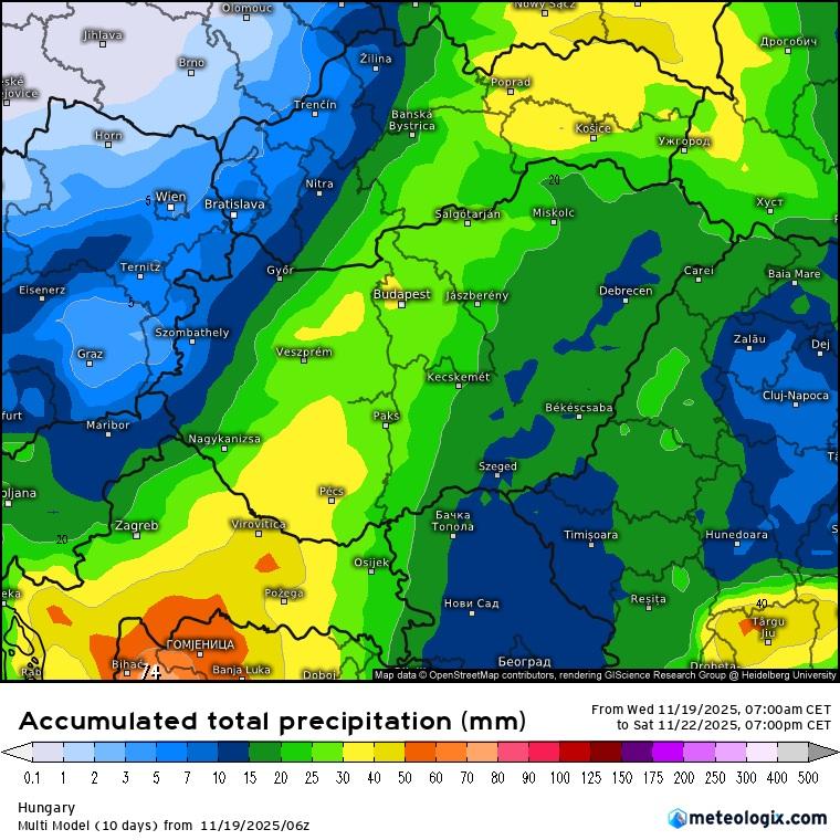 Ami a csapadék mennyiségét illeti, hosszú idő után az ország nagy részén számíthatunk jelentős mennyiségű csapadékra, a Barcs-Budapest-Salgótarján tengelyen 30 mm-nél is több csapadék hullhat le.