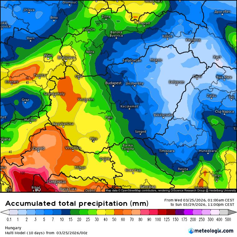 Visszatérve a csapadékra, csütörtök délutántól dél felől intenzív csapadékhullás kezdődik,mely leginkább a Dunántúlt érinti majd. A beáramló hideg levegőnek köszönhetően a Dunántúl magasabb hegyein az esőt fokozatosan havas eső, havazás válthatja fel, sőt péntekre virradó éjszaka a Nyugat-Dunántúlon síkvidéken is előfordulhat havas eső, havazás. Pénteken napközben a csapadékzóna súlypontja áttevődik az ország délnyugati felére, és ott további jelentős csapadék várható. Továbbra is hatalmas különbségek lesznek hőmérséklet terén, a Dunántúl nyugati felén kora télies hőmérsékletek uralkodhatnak 1 és 4 fok között lehet a hőmérséklet, míg északkeleten akár 20 fokot is mérhetünk.