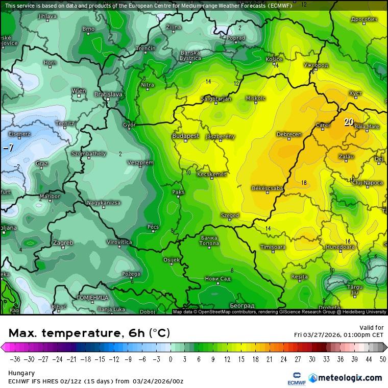 Hőmérsékleti maximumok péntek délutánig (ECMWF-modell)