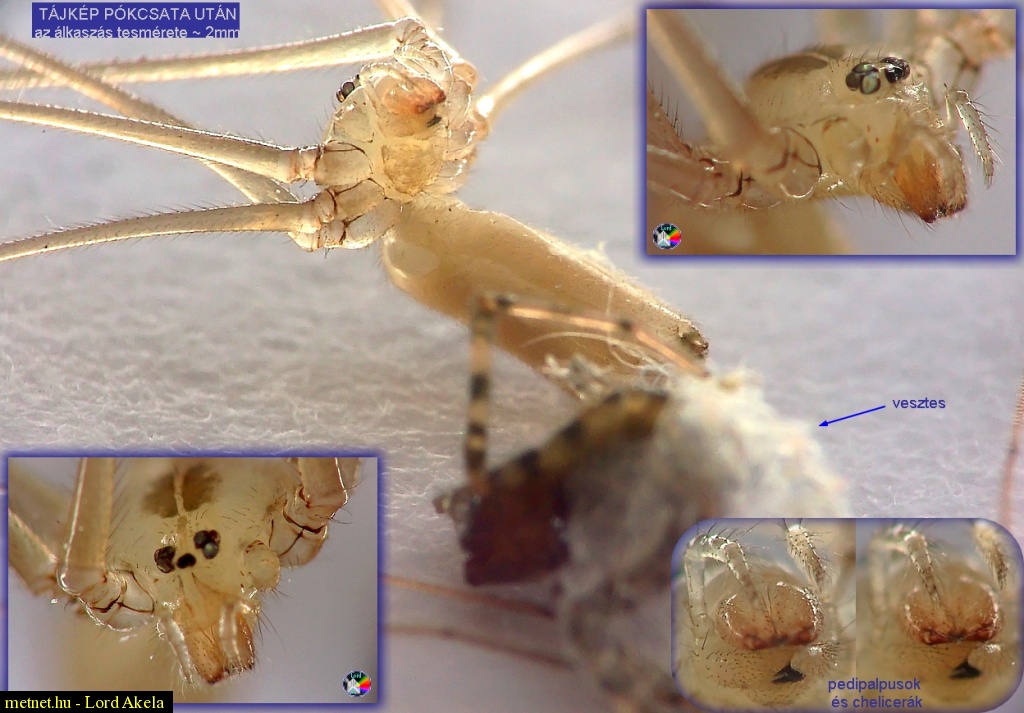 | Leírás: Kamaszodó (~ 2mm testméretû) álkaszáspók egy kölyökpók tetemével összecsapás után | |