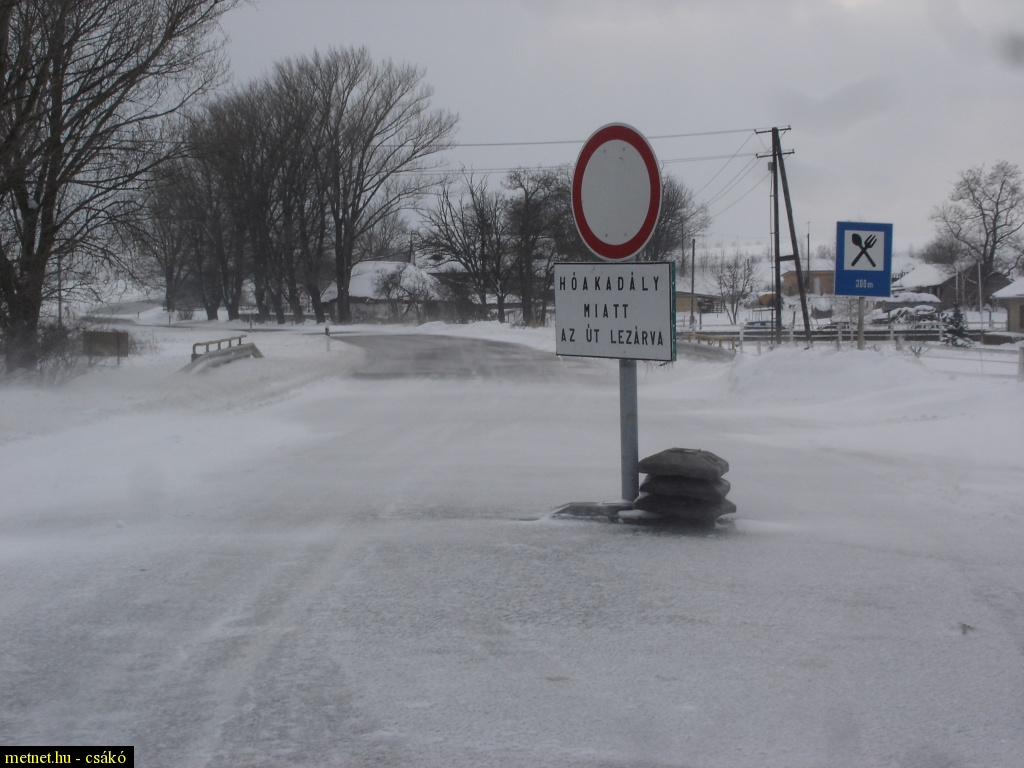 | Leírás: Hófúvás miatt a Tapolca felé vezetõ utat lezárták Nemesvámosnál. | |