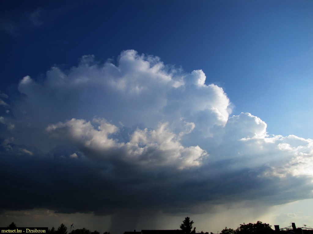 2010-05-23 18:53:42 - Kosakiss Csodaszép, tipikusan helyi jellegû zivatarcella, amelynek teteje épp kezd borzasodni, s amelybõl a csapadék zöme a felhõtömb közepébõl hullik ki. Ez a felvételen jól látszik.