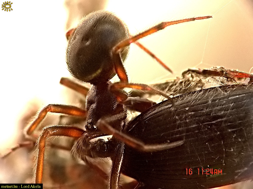 | Leírás: Az áldozat kétszer nagyobb mint a süvölvény pók. Elcsitult a küzdelem, a pók teszi a dolgát. EXIF F8,0 ISO64 1/600 (Sony F828 3264p telézés+digizoom makro módban) | |