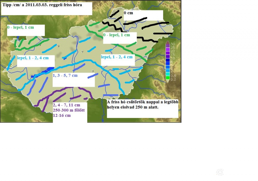 | Leírás: Hótipp az érintõ mediterrán ciklon által okozott havazására. Az intervallumokban szereplõ sok szám a biznytalanságot próbálja kifejezni. A vonalak csak hozzávetõleges vonalak, ezektõl a valóság el fog térni, mint ahogy a tippelt cm-tõl is.:) A silány grafikai minõségért elnézést kérek! | |