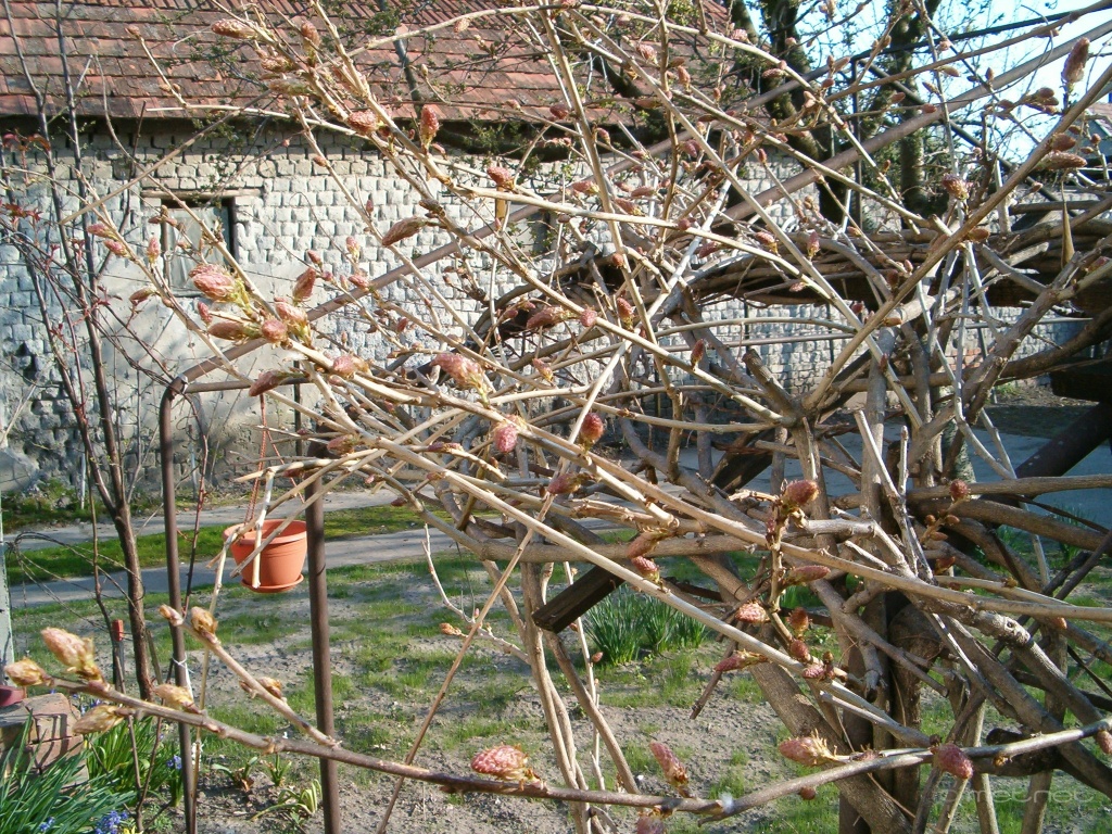 | Leírás: A kert; Törpe tulipán-fehér ibolya-írisz. Futó rózsa.- Lila akác. |