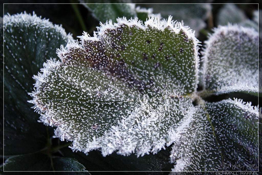 | Leírás: Erõs dérképzõdés egy szamócalevélen! Tmin: 4.6°C | |