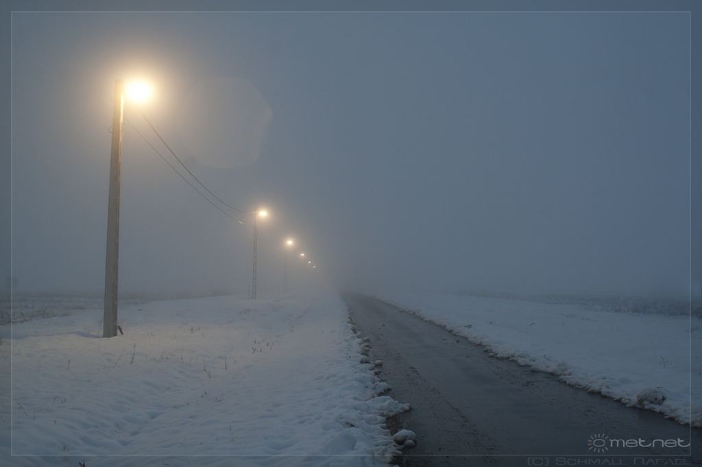 | Leírás: Szürkületben készült képek jókora ködrõl, 6centis hótakaróról. Fagyottesõ tette kellemetlenebbé a fényképezést, de sebaj. :-) | |