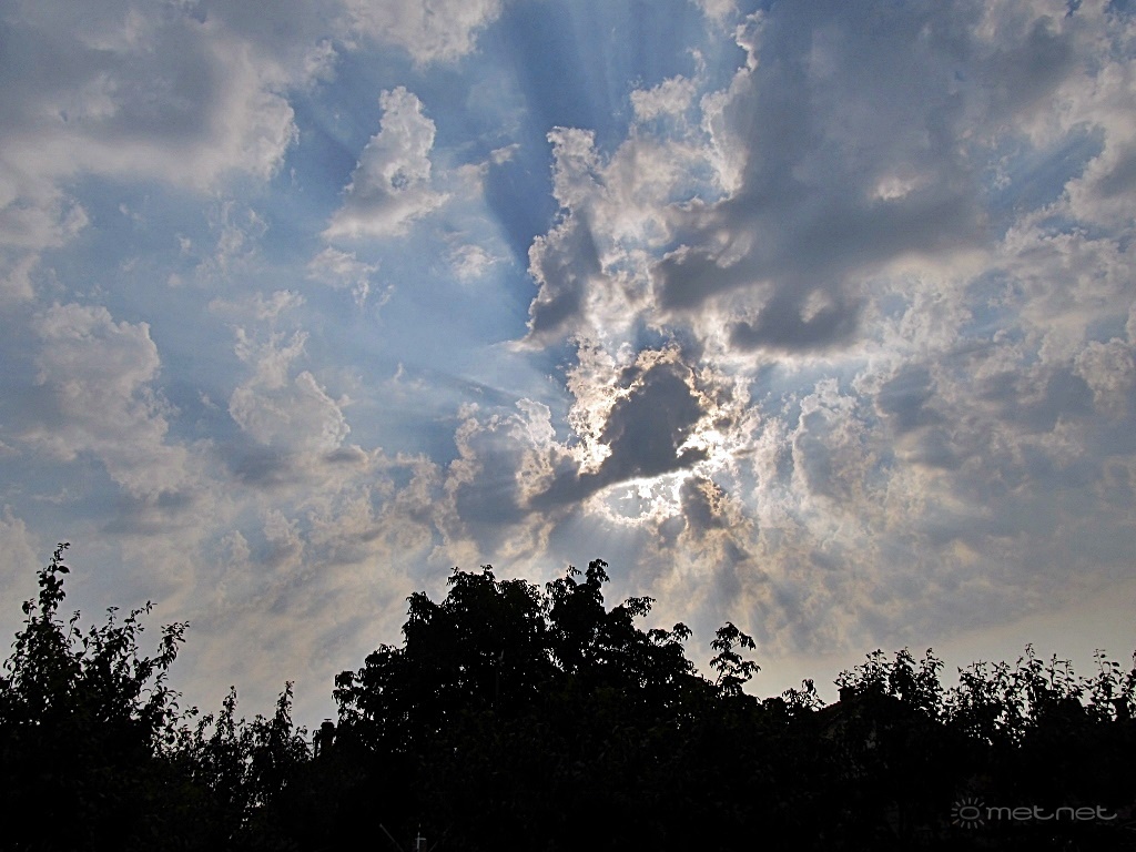 | Leírás: Altocumulus floccus (ac flo). Pamacsos középmagas gomolyfelhõ. +Tyndall-sugarak. |