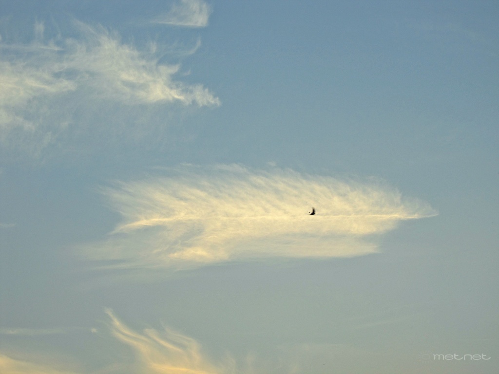 | Leírás: Cirrus vertebratus (Ci Ve). Rostos fátyolfelhõ. Megspékelve egy madárkával. |